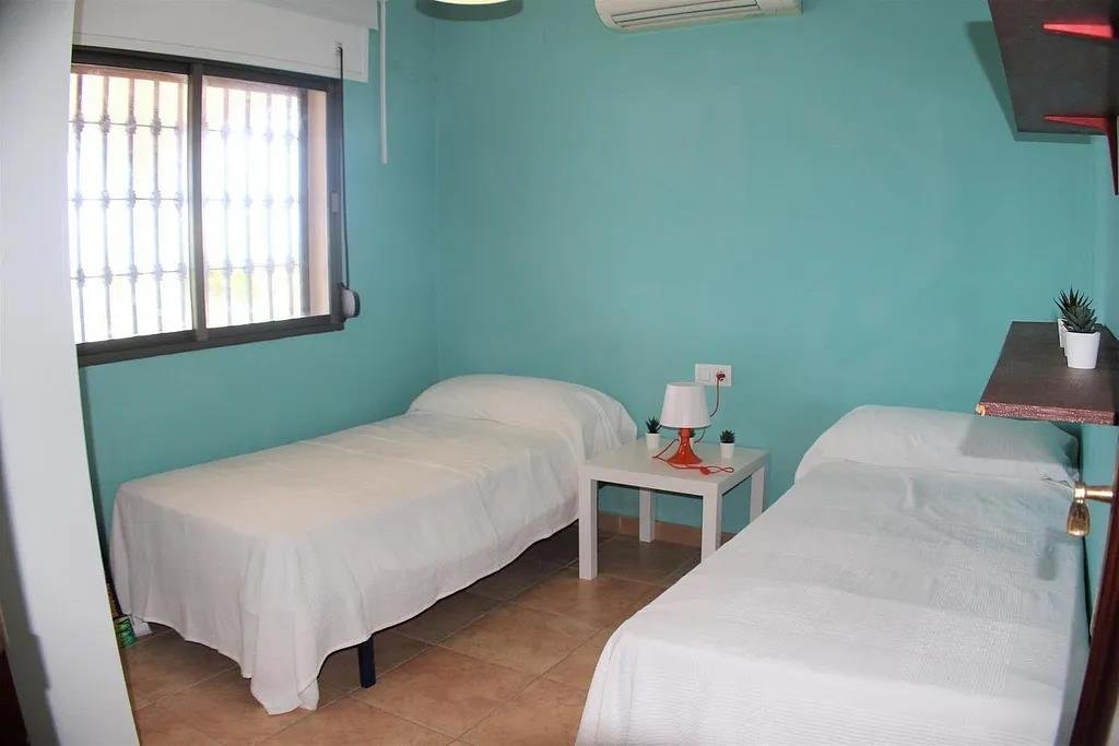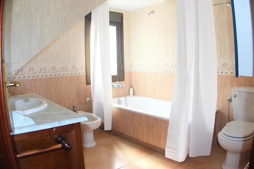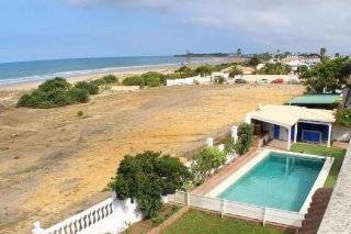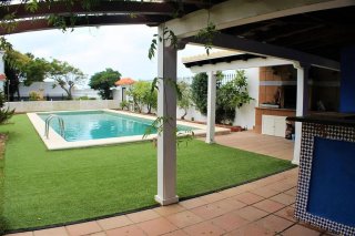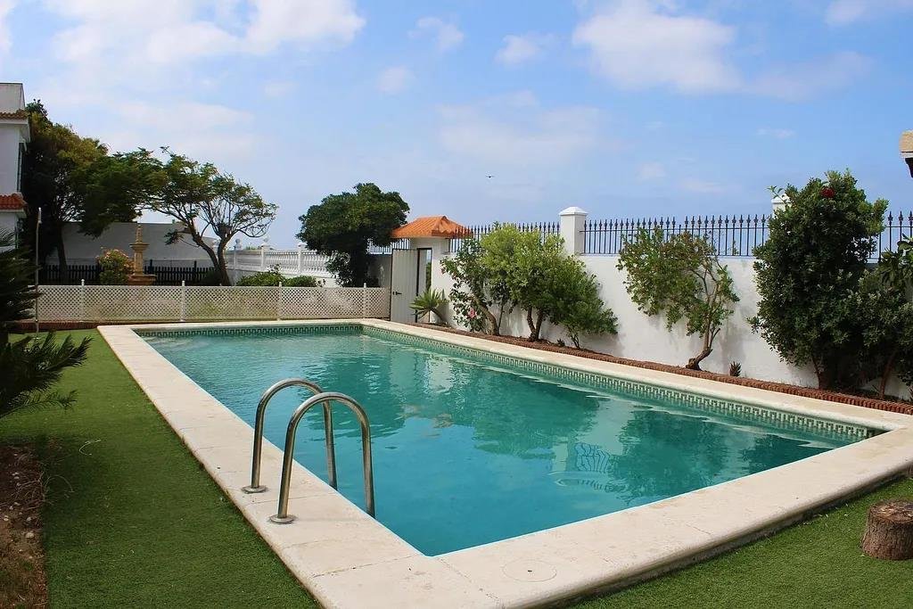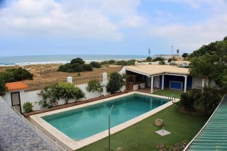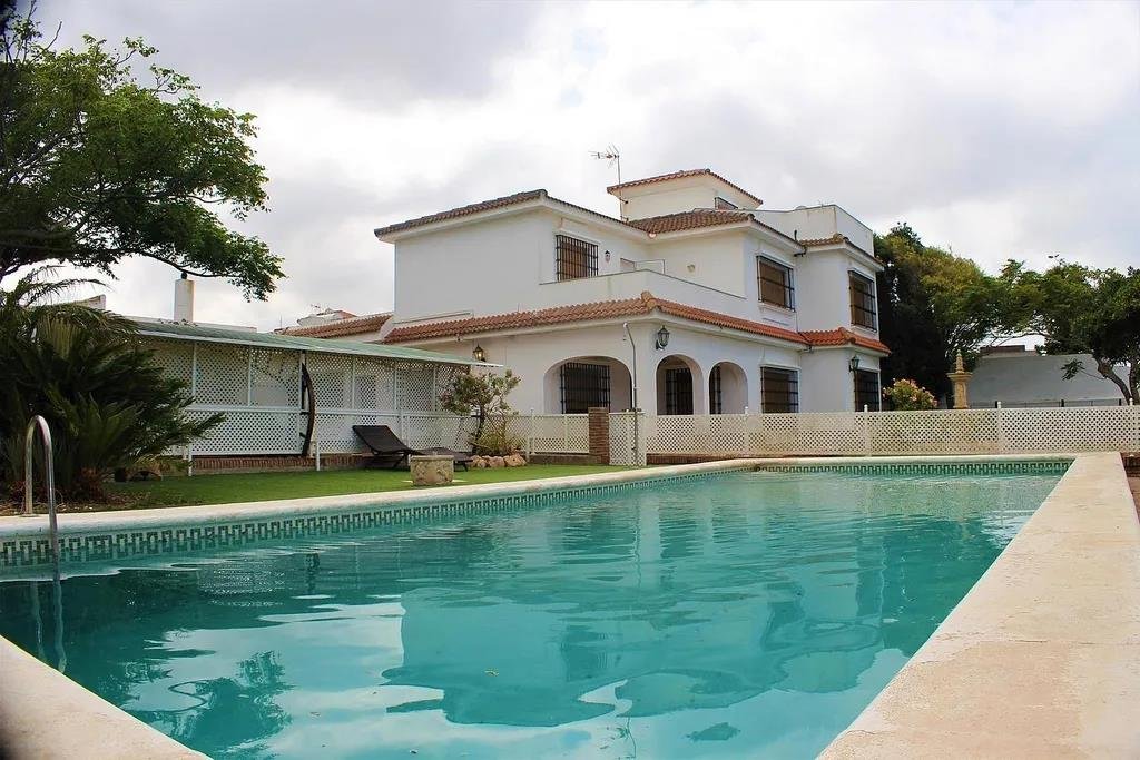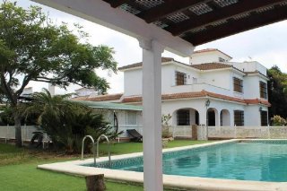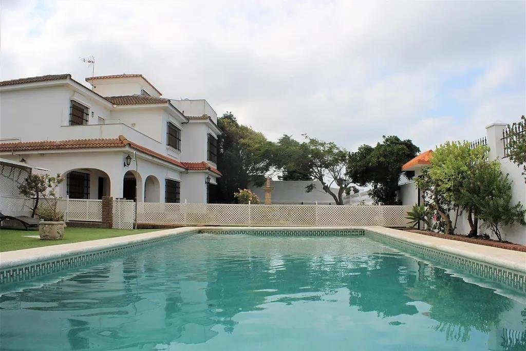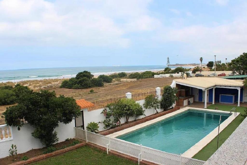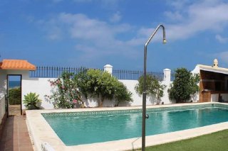 Chalet con vistas al mar a 100 m de la playa, 5 dormitorios, 4 baños, salón comedor, cocina equipada, aire acondicionado, barbacoa, jardín, muebles, piscina propia, terraza, garaje doble.