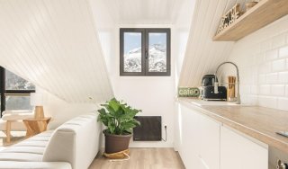 Avenida De Los Pirineos 1 4H 22640 Formigal Esc. F Edificio Crestas Precioso ático recién reformado y a estrenar de estilo alpino , situado en el Edificio Crestas de Formigal La vivienda con una inmejorable orientación sur, proporciona vistas despejadas a las pistas de esquí de Formigal y destaca por su modernidad y su luminosidad. Se encuentra en la cuarta planta del Edificio con ascensor desde el garaje, dispone de tres dormitorios y dos baños completos. La cocina de tipo americano totalmente actualizada y equipada se integra a la perfección con el salón que dispone de un gran ventanal y una bonita chimenea decorativa para disfrutar.